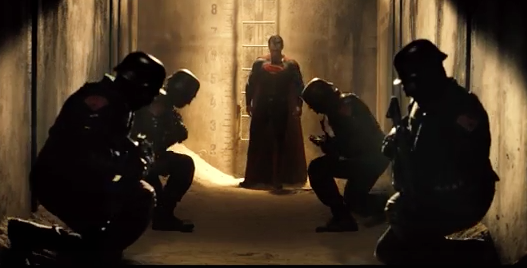 In another clip from above you see armed men bowing in what looks like and underground bunker. They seem to be bearing the famous superman logo (It’s an S) showing some sort of following. It personally reminds me of the Young Justice cartoon were Superboy receives patches from Lex Luther to enable him to gain the full powers of Superman, but I doubt that will be the case here. Unless this secret underground bunker is a secret project run off the DNA of the corpse of General Zod? But I’m thinking out loud on that one. It is clear that this ‘God-like’ persona is at play here and will really be questioned in this movie.