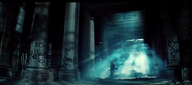 The next clip is of particular interest to me as it shows Batman in the distance looking up whilst lighting is clearly above him. One thing that I noticed is the Riddler question mark graffiti in the lower left corner. As I mentioned this is the first movie to start the cinematic universe and Batman has already fought a catalogue of villains. Underneath there is also a “Grootie” which I think is a little gag at Marvel’s Guardians of the Galaxy, but that’s just me looking again probably.