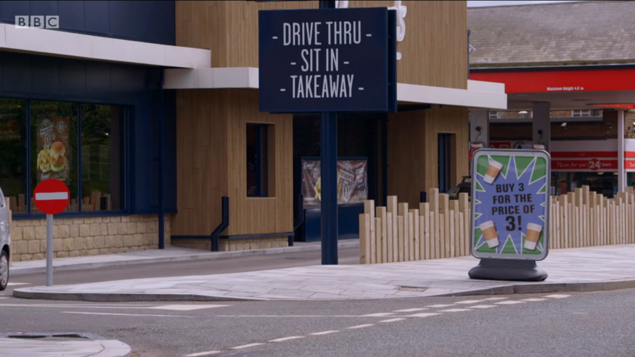 Just before Kayleigh ‘treats’ John to a muffin and a hot beverage. the establishing shot seemingly shows us a run-of-the-mill drive thru. Look a bit closer and you’ll see a rather amazing deal of three drinks for the price of three, get them while they’re hot!